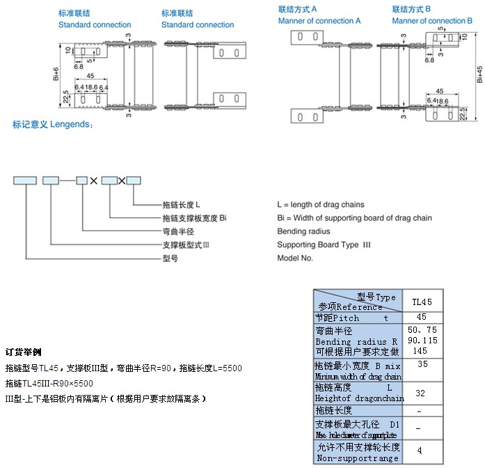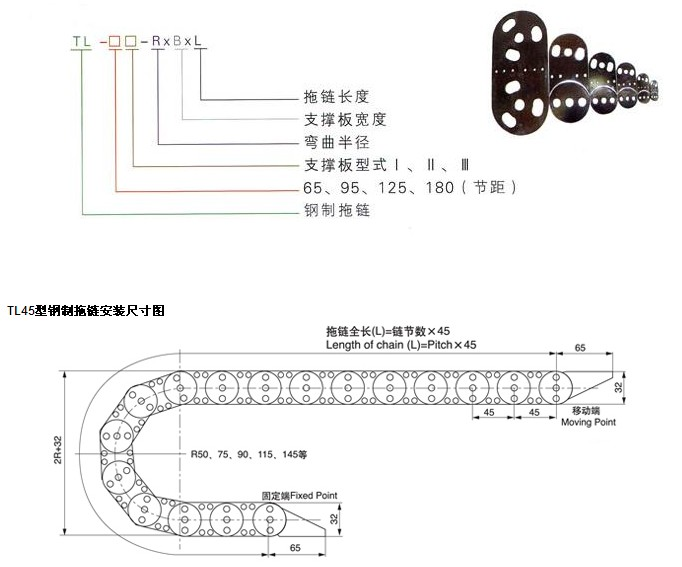 TL45型鋼制拖鏈按結(jié)構(gòu)可分為T(mén)L型鋼制拖鏈和TLG型鋼制拖鏈,鋼制拖鏈按節(jié)距分類(lèi)有45、65、75、95、100、125、180、225、250型。拖鏈寬度可按用戶(hù)要求定做,彎曲半徑從50-800之間。有三種支撐板的形式。(1)當(dāng)拖鏈需承載較大管、纜負(fù)荷時(shí)、應(yīng)選用高強(qiáng)度支撐板——整塊式(2)當(dāng)管纜的管接頭尺寸大于支撐板內(nèi)腔孔徑或須經(jīng)常拆裝、維修等時(shí)??蛇x用支撐板——分開(kāi)式(3)安裝管纜的規(guī)格品種較多時(shí),可選用支撐板——框架式。