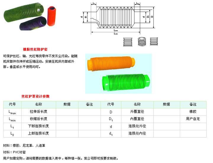絲杠防護罩可以用來對絲杠、光杠、立柱、心軸及其它的圓形旋轉(zhuǎn)柱體進行防護??梢运交虼怪笔褂?。水平使用時建議使用塑料或鋁的支撐環(huán),保持護罩內(nèi)腔與絲桿之間有一定均勻的距離,延長使用壽命。拉伸長度大時可以在每個折中加上金屬環(huán),提高護罩的穩(wěn)定性。連接或固定端通常使用金屬法蘭盤,也可以選擇套箍式。